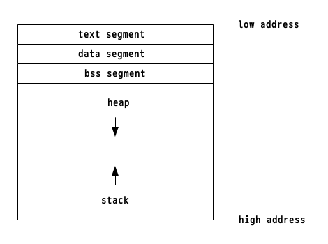 テキストセグメントには実行されるコード、データセグメントは初期化済みのグローバル変数、bssセグメントには初期化されていないグローバル変数、ヒープセグメントは、mallocなどで動的に確保される変数が配置されます。