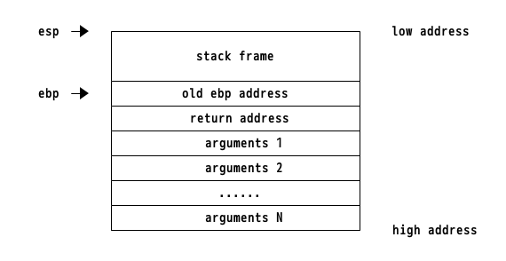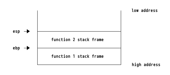 スタックのアドレスは高値から低位に伸びていき、ebp, espレジスタにスタックのアドレスが保存されます。 以下の画像の様に、ebpは現在の関数のスタックの底を、espはスタックのトップを表しています。